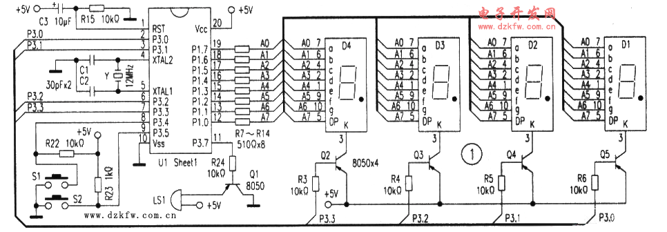 89C2051單片機端口設置:Pl口分別接數碼管的段碼口(a~h);P3.0、P3.1、P3.2、P3.3、分別接LED數碼管的位驅動;P3.4接按鍵51,P3.5接按鍵52;P3,7驅動蜂鳴器。C3、R15構成上電復位電路。Q1~Q4為數碼管顯示驅動三極管。電路中沒有畫出電源部分,電路中的電源可以利用手機萬用充電器作為本電路的供電部分。