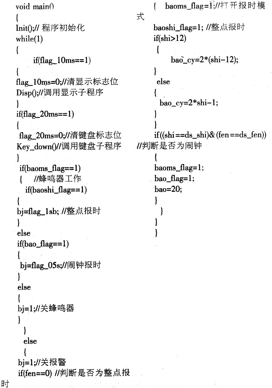 程序由主程序、定時中斷子程序,鍵盤子程序組成。定時中斷子程序要產生Imo日刂鐘標志位,用于數碼管掃描髖示;20ms時鐘標志位,用于鍵盤掃描、消抖;0,5s的時鐘佶號,用于鬧鐘報瞥;1s時鐘標志位,用于時間更新;1s的時鐘信號,用于整點報時;及報騖時更新蜂鳴器鳴響次數,以下是該電子鐘的部分程序。