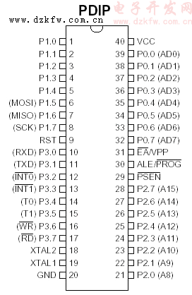 AT89S51有PDIP、PLCC、TQFP三種封裝方式,其中最常見的就是采用40Pin封裝的雙列直接PDIP封裝,外形結(jié)構(gòu)下圖。