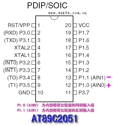AT89C2051為20引腳小型封裝,2K內(nèi)部程序存儲器,15個可編程I/O口線,沒有P0口和P2口的16根I/O線,內(nèi)部集成了一個模擬比較器。AT89C2051單片機的引腳排列如下圖所示。