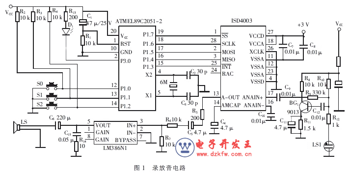 工作原理:利用單片機AT89C2051做為主控單元,如圖所示。按下“S0”鍵,當看到接在P3.0口的發光二極管發光后,錄入第1段語音;按“S1”鍵,接在P3.0口