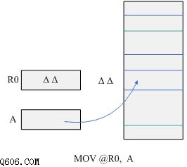 例:MOV @R0, A ;A——>以R0內容為地址的內部RAM中