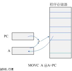 由寄存器DPTR或PC中的內容加上A累加器內容之和而形成操作數地址的尋址方式稱為變址尋址。變址尋址只能對程序存儲器中的數據進行尋址操作。由于程序存儲器是只讀存貯器,因此變址尋址只有讀操作而無寫操作。在指令符號上采用MOVC的形式。