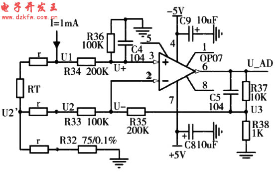 恒流源驅動電路負責驅動溫度傳感器Pt100,將其感知的隨溫度變化的電阻信號轉換成可測量的電壓信號,實現R-V轉換. 恒流源電路由運算放大器OP07 基準電壓源電阻和三極管組成,為避免激勵電流產生的熱量影響測量精度,設計恒流源的大小為1mA. 具體實現如圖3所示. VZ1是一個2.5V的穩壓管,即U1-U3=2.5V; 根據運放的虛短原則,運算放大器OP07的同相端電壓和反相端電壓值相等,即U2=U3; 因此,電阻R31兩端的電壓U1-U2=2.5V; 可以計算出流經R31的電流為2. 5V/2. 5K =1mA. 根據運放虛斷原理,可知,流過R31的電流將幾乎全部流入復合管而不流入運放的反向端,則由復合管集電極輸出電流為1mA,實現了高精度恒流源的設計。
