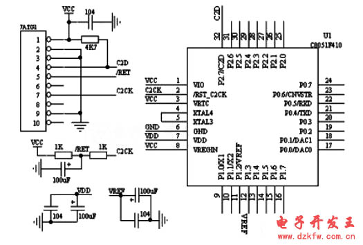 C8051F410片上系統是本測溫系統的控制核心. 其基本外圍接口電路是保證系統正常工作的輔助電路,包括C8051F410片上系統工作所需要的JATG接口電源退耦基準濾波上電復位等基本外圍電路,如圖2所示。