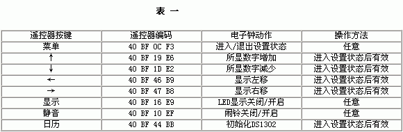 遙控器采用長虹彩電K11F型遙控器,遙控器按照16位地址碼,8位數據碼以及8位數據碼的反碼發送。表一列出了各按鍵的編碼及本電子鐘對應的動作。如果采用其他遙控器,需對程序相應部分的編碼作修改。