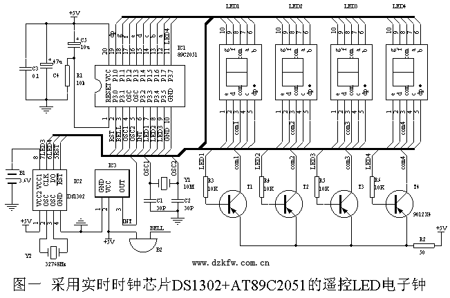 關鍵字:電子鐘,紅外遙控,DS1302,89C2051,LED電子鐘