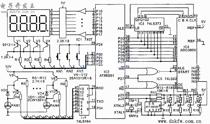 本裝置的工作原理如下圖所示,IC2為主控芯片AT89S51,IC4為8位逐次逼近式A/D轉(zhuǎn)換芯片ADC0809,RT1~RT4分別是測(cè)量CPU、電源、機(jī)箱、顯卡溫度的熱敏電阻,F(xiàn)AN1~FAN4分別是控制CPU、電源、機(jī)箱、顯卡溫度的風(fēng)扇。以CPU溫度控制為例,當(dāng)溫度升高時(shí)RT1阻值變小,A點(diǎn)電壓升高,該變化的電壓作為待轉(zhuǎn)換的模擬量進(jìn)入ADC0809的輸入通道IN0,經(jīng)AD轉(zhuǎn)換、查表后換算成溫度值在數(shù)碼管上顯示出來(lái),其中最左邊一位顯示“1”(1代表CPU,2代表電源,3代表機(jī)箱,4代表顯卡),左邊第二位不顯示,最后兩位顯示CPU當(dāng)前的實(shí)際溫度值。顯示范圍為0~70℃,當(dāng)溫度低于設(shè)定的溫度下限時(shí),單片機(jī)通過(guò)串行口發(fā)出控制指令經(jīng)74LS164.移位輸出,使V5、V9截止,風(fēng)扇FAN1停止轉(zhuǎn)動(dòng)。
