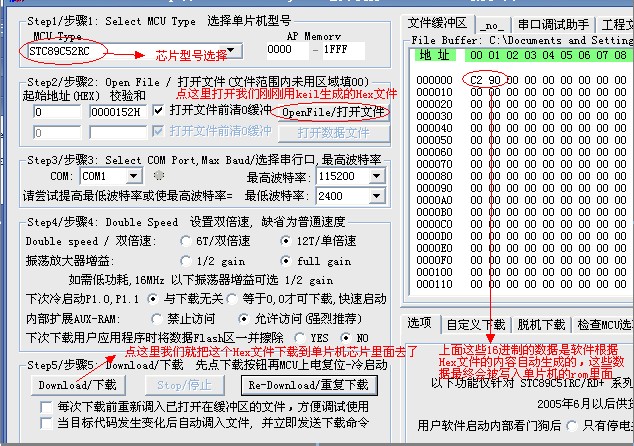 好了…… ,我們把 SETB P1.0 這條匯編語句用keil軟件編譯生成Hex文件,然后用圖3所示的軟件和圖1所示的硬件(用串口連接電腦)下載到我們已經做好的電路板上的單片機芯片里去(圖省事的話建議直接買個開發板),然后接通電源……什么?燈不亮?這就對了,因為我們寫進去的指令就是讓P10輸出高電平,燈當然不亮,要是亮就錯了。所以要將keil編緝區的內容改為CLR P1.0,重新編譯生成Hex文件,重新下載,接電,好,燈亮了。因為我們寫入的Hex就是讓P10輸出低電平的指令。這樣我們看到,硬件電路的連線沒有做任何改變,只要改變寫入單片機中的內容,就能改變電路的輸出效果。