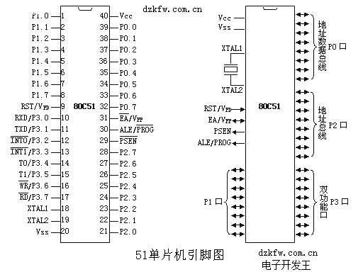 單片機的40個引腳大致可分為4類:電源、時鐘、控制和I/O引腳。