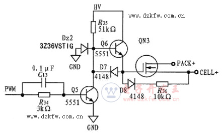 在一個PWM周期中,當PWM信號為高時,低邊NPN三極管5551導通,使高邊NPN三極管5551基極拉低,三極管關斷,場效應管門級變為低電平,場效應管關斷;當PWM信號為低時,低邊NPN三極管5551關斷,高邊NPN三極管5551被上拉電阻拉高,三極管導通,場效應管門級變為高電平,場效應管導通;在每一個PWM周期中,重復以上過程。