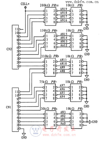 20節電池電壓經過不同阻值的分壓電阻,進入CPU進行AD轉換,得到不同AD采樣值,再通過內部軟件恢復出實際的電壓值,相鄰電壓值之差即是單節電池電壓。