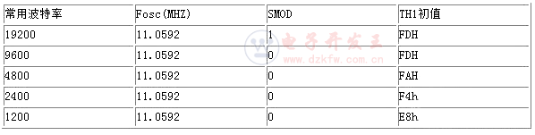 下表列出了定時器T1工作于方式2常用波特率及初值。