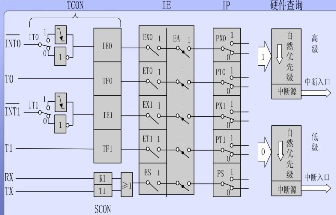 如圖所示,由與中斷有關的特殊功能寄存器、中斷入口、次序查詢邏輯電路等組成,包括5個中斷請求源,4個用于中斷控制的寄存器IE、IP、ECON和SCON來控制中斷類弄、中斷的開、關和各種中斷源的優先級確定。