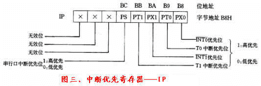 IP在特殊功能寄存器中,字節地址為B8H,位地址(由低位到高位)分別是B8H一BFH,IP用來設定各個中斷源屬于兩級中斷中的哪一級,IP的基本格式如下圖三所示:
