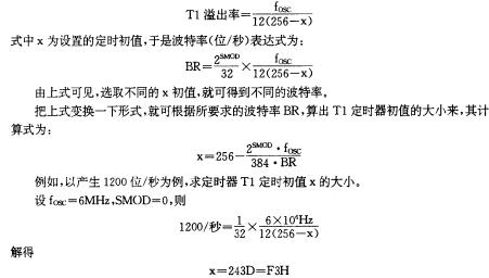 對方式1和方式3來說,波特率的計算式為2SMOD/32×T1溢出率,根據SMOD狀態位的不同,波特率有Tl/32溢出率和T1/16溢出率兩種。由于T1溢出率的設置是方便的,因而波特率的選擇將十分靈活。