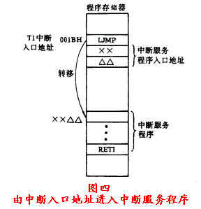 由于各個中斷入口地址相隔甚近,不便于存放各個較長的中斷服務程序,故通常在中斷入口地址開始的二三個單元中,安排一條轉移類指令,以轉入到安排在那兒的中斷服務程序。以T1中斷為例,其過程下如圖四所示。