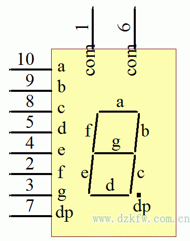數(shù)碼管分為共陽(yáng)數(shù)碼管和共陰數(shù)碼管,所謂的共陰數(shù)碼管就是8只LED小燈的陰極是接在一起的,也就是陰極是公共端,由陽(yáng)極來(lái)控制小燈是否亮滅。同理,共陽(yáng)數(shù)碼管就是陽(yáng)極是接到一起的,大家可以仔細(xì)研究下圖1。細(xì)心的同學(xué)也會(huì)發(fā)現(xiàn),數(shù)碼管上邊有2個(gè)com,實(shí)際上就是我們數(shù)碼管的公共端。為什么有2個(gè),我個(gè)人認(rèn)為,一方面有2個(gè)可以起到對(duì)稱(chēng)的效果,剛好是10個(gè)引腳,另外一個(gè)方面,公共端通過(guò)的電流較大,我們初中就學(xué)過(guò),并聯(lián)電路電流之和等于總電流,用2個(gè)com可以把公共電流平均到2個(gè)引腳上去,降低線路承受的電流。