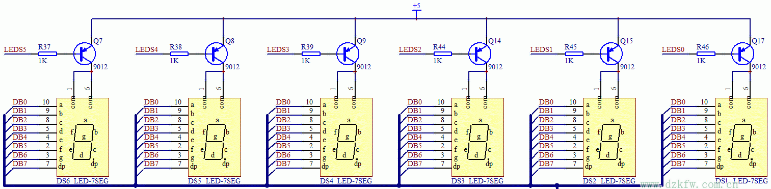 他們的com是接到了正極上,當(dāng)然了,和LED小燈電路類(lèi)似,也是由74HC138控制了三極管的導(dǎo)通來(lái)控制整個(gè)數(shù)碼管的電流,我們先來(lái)看DS1這個(gè)數(shù)碼管。原理圖上可以看出來(lái),控制DS1的三極管是Q17,控制Q17的引腳是LEDS0,對(duì)應(yīng)到74HC138上邊就是Y0端的輸出。