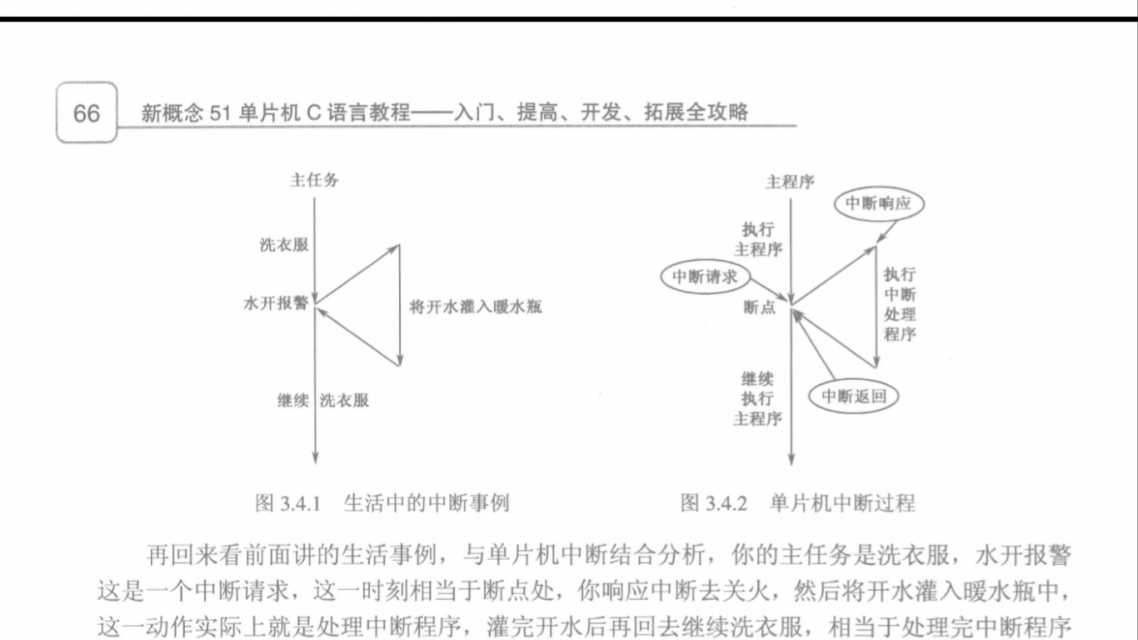 對于單片機來說,中斷是指CPU在處理某一事件A,發生了另一事件B,請求CPU迅速去處理(中斷發生);CPU暫時停止當前的工作(中斷響應),轉去處理事件B(中斷服務);待CPU將事件B處理完畢后,再回到原來的事件A被中斷地方繼續處理事件A(中斷返回),這一過程成為中斷。