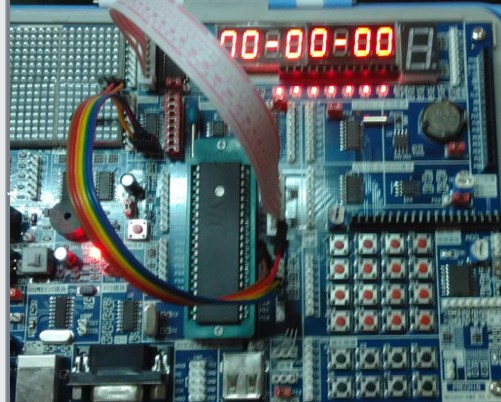 現在就來看程序://加語句 是解釋語句 不是程序 運行時直接略去! #include<reg51.h> //51系列單片機頭文件 #define uchar unsigned char //宏定義 #define ab P0 //--定義全局變量--// uchar int_time; uchar a,b,c; sbit duanA=P2^2; sbit duanB=P2^3; sbit duanC=P2^4; unsigned char code table[]={0x3f,0x06,0x5b,0x4f,0x66,0x6d,0x7d,0x07, 0x7f,0x6f,0x77,0x7c,0x39,0x5e,0x79,0x71}; //0、1、2、3、4、5、6、7、8、9、A、b、C、d、E、F的顯示碼 uchar DisplayData[8]; //用來存放要顯示的8位數的值 void Digdisplay(); //--聲明全局變量--// /****************************中斷子程序*******************************/ void clock(uchar a,b,c) { DisplayData[0]=table[c/10]; DisplayData[1]=table[c%10]; DisplayData[2]=0x40; DisplayData[3]=table[b/10]; DisplayData[4]=table[b%10]; DisplayData[5]=0x40; DisplayData[6]=table[a/10]; DisplayData[7]=table[a%10]; Digdisplay(); } 對于上面的綠底的時鐘程序包括一些有點基礎看的不是很懂,因為我的開發板上有138譯碼器。上面的程序用譯碼器的原理控制的8個數碼管而不是P2這個I/O端口,它完全可以替換成用P2端口控制的。可參照我的周記二來寫。上面就用到了簡單運算來改變參數如C/10,C=10則等于1,/是運算符號除法取商,%是除法取余; /*****************************中斷主程序*****************************/ void main() { TMOD=0x01; //設定使用定時器0方式 TH0=(65536-46083)/256; //裝初值 TL0=(65536-46083)%256; //... EA=1; //打開全局中斷控制 ET0=1; //打開定時器0中斷 TR0=1; //啟動定時器0 int_time=0; //中斷計數變量初始值 a=0; //秒計數變量初始值 b=59; //分計數變量初始值 c=23; //時計數變量初始值 while(1) //程序在這里不停的對數碼管動態掃描同時等待中斷發生 { clock(a,b,c); //調用中斷日期子程序 } }上面程序中紅色的程序用到的定時器只是其中一種,定時器的使用方式也是。具體的中斷比這復雜許多,詳情請參照相關書籍! 下面用紅底寫的程序就是138譯碼器的位選程序switch是選擇語句,case是選擇執行語句 void Digdisplay() { uchar i,j; for(i=0;i<8;i++) { switch(i) //位選,選擇點亮的數碼管, { case 0: duanA=0;duanB=0;duanC=0;break; //顯示第0位 case 1: duanA=1;duanB=0;duanC=0;break; //顯示第1位 case(2): duanA=0;duanB=1;duanC=0;break; //顯示第2位 case(3): duanA=1;duanB=1;duanC=0;break; //顯示第3位 case(4): duanA=0;duanB=0;duanC=1;break; //顯示第4位 case(5): duanA=1;duanB=0;duanC=1;break; //顯示第5位 case(6): duanA=0;duanB=1;duanC=1;break; //顯示第6位 case(7): duanA=1;duanB=1;duanC=1;break; //顯示第7位 } ab=DisplayData[ i]; //發送段碼 j=50; //掃描間隔時間設定 while(j--); ab=0x00; //消隱 } } /*************************定時器T0的中斷服務子程序*********************/ void T0_time() interrupt 1 { // uchar a,b,c; TH0=(65536-50000)/256; //重裝初值 TL0=(65536-50000)%256; //重裝初值 int_time++; if(int_time==20) //如果到了20次,說明1s時間到 { int_time=0; a++; } if(a==60) { b++; a=0; } if(b==60) { c++; b=0; } if(c==24) { c=0; } } 顯示效果圖如下: 燒錄程序,開始顯示初始值,定時器中斷程序,在設定的1S后發出中斷請求(如何設定中斷發生時間具體請參照相關書籍),進入中斷服務子程序中,秒加1,顯示改變。回到被中斷地方繼續工作,顯示的是中斷后的數據,每隔1S中斷一次 ,數據更新一次,數值到了一定程度,就會遇到if 語句如 if(a==60) { b++; a=0; } if(b==60) { c++; b=0; } if(c==24) { c=0; } 分加一,秒清零;時加一,分清零;就形成了時鐘。