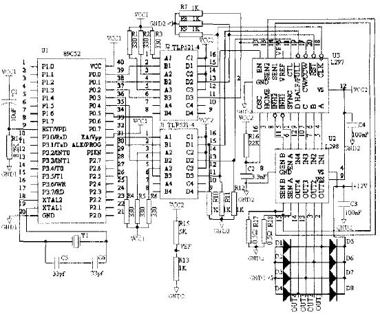 步進電動機是一種將電脈沖信號轉換成角位移或線位移的精密執行元件,由于步進電機具有控制方便、體積小等特點,所以在數控系統、自動生產線、自動化儀表、繪圖機和計算機外圍設備中得到廣泛應用。微電子學的迅速發展和微型計算機的普及與應用,為步進電動機的應用開辟了廣闊前景,使得以往用硬件電路構成的龐大復雜的控制器得以用軟件實現,既降低了硬件成本又提高了控制的靈活性,可靠性及多功能性。市場上有很多現成的步進電機控制機構,但價格都偏高。應用SGS公司推出的L297和L298兩芯片可方便的組成步進電機驅動器,并結合AT89C52單片機進行控制,即可以實現用相對便宜的價格組成一個性能不錯的步進電機驅動電路。