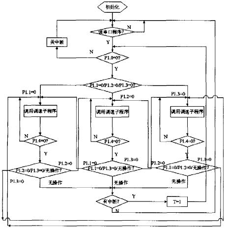 本例中.為計算方便,把各離散點的速度所需的裝載值用公式轉化為各自所需的定時時間固化在系統的ROM 中,這里用TH0=(65536-time)/256,TL0=(65536-time)%256來計算裝載值,time表示各階梯所需定時時間。系統在運行中用查表法查出所需的時間,從而大幅度減少占用CPU的時間,提高系統的相應速度。因此.該程序主要由控制主程序、加減速子程序組成,主程序框圖如圖4所示。