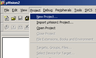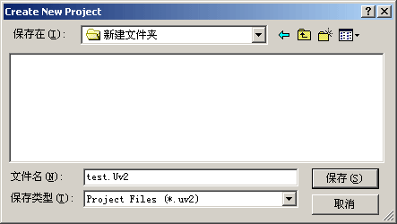 (1)點擊Project菜單,選擇彈出的下拉式菜單中的New Project,如圖1-2。接著彈出一個標準Windows文件對話窗口,如圖1-3,這個東東想必大家是見了N次的了,用法技巧也不是這里要說的,以后的章節中出現類似情況將不再說明。在"文件名"中輸入您的第一個C程序項目名稱,這里我們用"test",這是筆者慣用的名稱,大家不必照搬就是了,只要符合Windows文件規則的文件名都行。"保存"后的文件擴展名為uv2,這是KEIL uVision2項目文件擴展名,以后我們可以直接點擊此文件以打開先前做的項目。