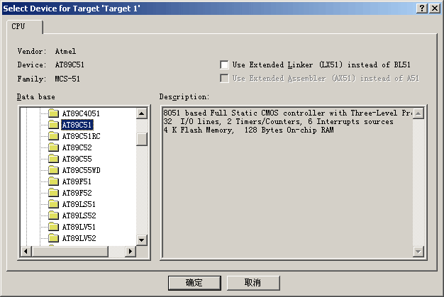 (2)選擇所要的單片機,這里我們選擇常用的Ateml公司的AT89C51。此時屏幕如圖1-4所示。AT89C51有什么功能、特點呢?不用急,看圖中右邊有簡單的介紹,稍后的章節會作較詳細的介紹。完成上面步驟后,我們就可以進行程序的編寫了。