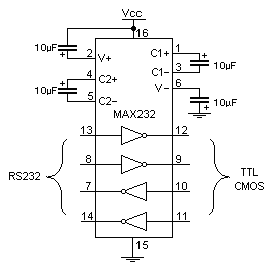 在制作電路前我們先來看看要用的MAX232,這里我們不去具體討論它,只要知道它是TTL和RS232電平相互轉換的芯片和基本的引腳接線功能就行了。通常我會用兩個小功率晶體管加少量的電路去替換MAX232,可以省一點,效果也不錯(如有興趣可以查看http://www.cdle.net網站中的相關資料)。下圖就是MAX232的基本接線圖。