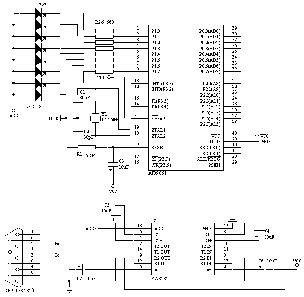 :( 還有這么多運算符呀!暫時停一停吧,我們先來做一個實驗吧。學習運算符和另外一些知識時,我們還是給我們的實驗板加個串行接口吧。借助電腦轉件直觀的看單片機的輸出結果,以后我還會用一些簡單的實例講解單片機和PC串口通訊的簡單應用和編程。如果你用的是成品實驗板或仿真器,那你就可以跳過這一段了。