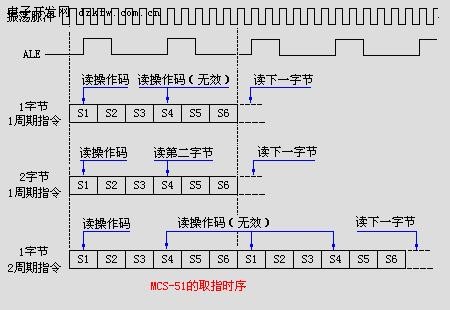 兩個機器周期需進行四讀指令操作,但只有一次讀操作是有效的,后三次的讀操作均為無效操作。