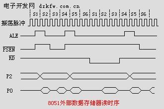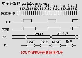 圖8051外部程序存儲器讀時序圖,從圖中可看出,P0口提供低8位地址,P2口提供高8位地址,S2結束前,P0口上的低8位地址是有效的,之后出現在P0口上的就不再是低8位的地址信號,而是指令數據信號,當然地址信號與指令數據信號之間有一段緩沖的過度時間,這就要求,在S2其間必須把低8位的地址信號鎖存起來,這時是用ALE選通脈沖去控制鎖存器把低8位地址予以鎖存,而P2口只輸出地址信號,而沒有指令數據信號,整個機器周期地址信號都是有效的,因而無需鎖存這一地址信號。