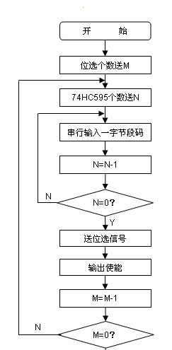 為實現(xiàn)24位或更多位LED顯示,本文提出了一種全新的方法。此方法結(jié)合了動態(tài)和靜態(tài)顯示的優(yōu)點,可以說是兩者的結(jié)合。連線圖如圖3所示。段選碼由三片74HC595控制,段選數(shù)據(jù)由74HC595的SER引腳串行輸入,由于輸出使能時鐘RCLK并接在一起,因此,三片74HC595并行輸出端同時輸出。而三個LED位選信號也并接在一起,因此,一次可以同時點亮三位LED。此過程類似于靜態(tài)顯示。每片74HC595并行輸出端并接8位LED,用于掃描輸出,此過程類似于動態(tài)掃描過程。此方法運用3片74HC595,n條位選信號,即可實現(xiàn)3n位LED顯示。成本低廉,而且節(jié)省資源。此種方法實現(xiàn)多位LED顯示程序框圖為圖4所示,MCU為89S52。