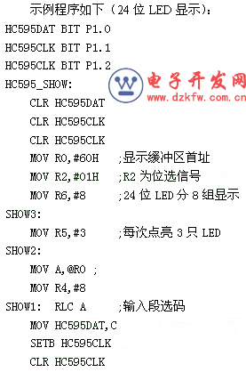 N位LED顯示時,只需要一片74HC595即可完成,成本最低。但是,此種方法的最大弱點就是當LED的位數(shù)大于12位時,出現(xiàn)閃爍現(xiàn)象,這是所有動態(tài)LED顯示方式共同的弱點。