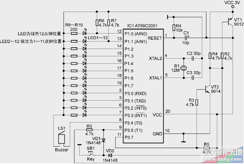 VT1為PNP的9012,當(dāng)電路不工作時VT1的B極由R4得到高電平,VT1截止,AT89C2051無法從VT1的E極得到電源。當(dāng) SW1按下時,VT1的B極通過VD2和SB1接地,由高電平轉(zhuǎn)為低電平,VT1導(dǎo)通。此時AT89C2051得電,同時通過C1,R4復(fù)位。復(fù)位成功后 P3.7升為高電平,使得VT2導(dǎo)通,從而使VT1的B極保持低電平狀態(tài),這時就算松開SB1,VT1也不會截止而導(dǎo)致MCU失電。當(dāng)AT89C2051 有關(guān)機指令時,P3.7引腳會被拉低,此時VT2截止,VT1的B極電壓因此升高,VT1也截止,AT89C2051失電。SB1起到了開關(guān)電源和設(shè)置的作用。在AT89C2051沒有得電時,SB1和VD2組成電源啟動電路,AT89C2051得電后SB1和VD1組成功能鍵電路。VD1、VD2的作用是防止在3V 的VCC接通時的瞬間電路自動開機。 R8~R19是LED限流電阻。R6~R7是針對P1.0、P1.1增加的上拉電阻。C1復(fù)位電容可以選擇4.7~22μF的電解電容。如果不需要自動斷電功能,可以去掉VT1、VT2、R2~R5、VD1、VD2,VD2去掉后換成導(dǎo)線,3V 的VCC加裝一電源開關(guān)連到AT89C2051的VCC引腳。
