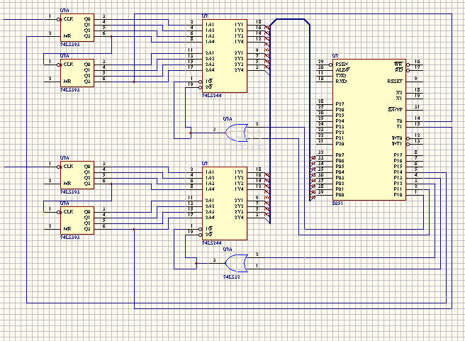 在頻率計設計中,硬件電路采用了8051單片機、雙四位二進制計數器74LS393、緩存器74LS244、8155帶RAM和定時器/計數器的可編程并行接口芯片、16K程序存儲器擴展芯片2716、十倍分頻器74s196、反向器74ls14、反向驅動器7406、7407等。所采用的芯片技術成熟,性能可靠,性價比較高。