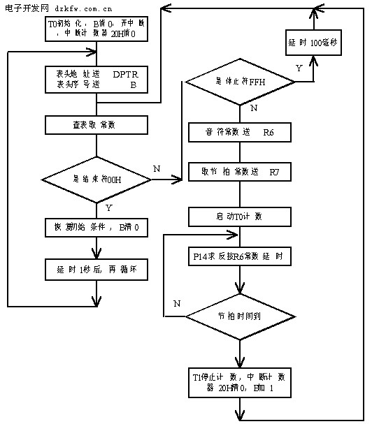 樂曲中,每一音符對應著確定的頻率,我們將每一音符的時間常數和其相應的節拍常數作為一組,按順序將樂曲中的所有常數排列成一個表,然后由查表程序依次取出,產生音符并控制節奏,就可以實現演奏效果。