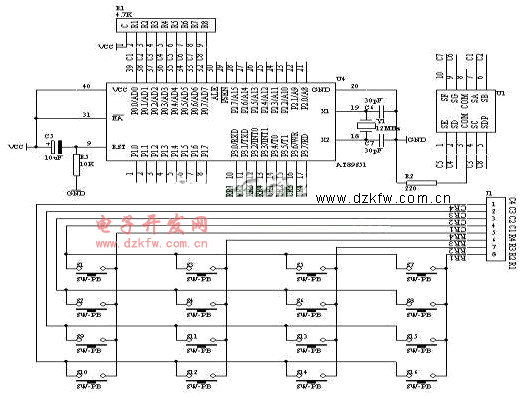 (2)每個按鍵都有它的行值和列值,行值和列值的組合就是識別這個按鍵的編碼。矩陣的行線和列線分別通過兩并行接口和CPU通信。鍵盤的一端(列線)通過電阻接VCC,而接地是通過程序輸出數字“0”實現的。鍵盤處理程序的任務是:確定有無鍵按下,判斷哪一個鍵按下,鍵的功能是什么?還要消除按鍵在閉合或斷開時的抖動。兩個并行口中,一個輸出掃描碼,使按鍵逐行動態接地;另一個并行口輸入按鍵狀態,由行掃描值和回饋信號共同形成鍵編碼而識別按鍵,通過軟件查表,查出該鍵的功能。