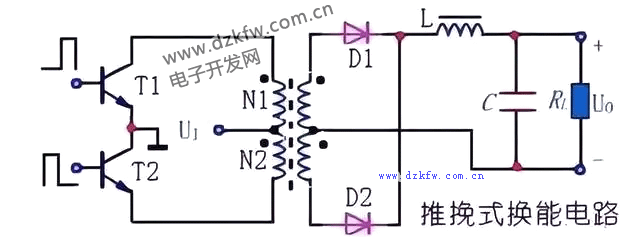 這種電路結構的特點是:對稱性結構,脈沖變壓器原邊是兩個對稱線圈,兩只開關管接成對稱關系,輪流通斷,工作過程類似于線性放大電路中的乙類推挽功率放大器。