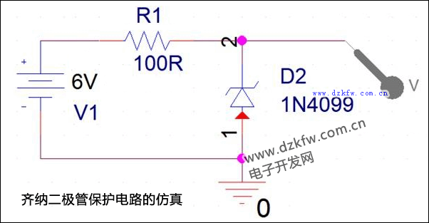 在此電子電路設(shè)計(jì)中,選擇了齊納二極管,使其電壓高于輸出的正常工作電壓,但低于會(huì)發(fā)生損壞的電壓。