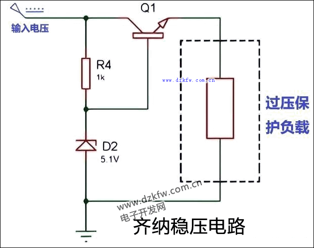 在使用齊納二極管的過(guò)壓保護(hù)電路中,齊納二極管和雙極性晶體管用于自動(dòng)過(guò)壓保護(hù),可以通過(guò)兩種方式實(shí)現(xiàn):