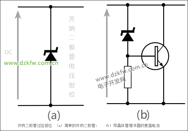 齊納二極管過(guò)壓鉗位(a) - 簡(jiǎn)單的齊納二極管,(b) - 帶晶體管緩沖器的更高電流