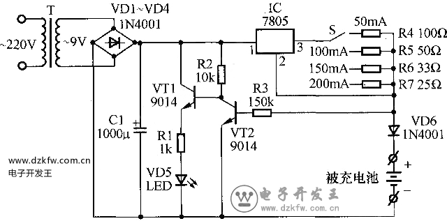 圖中是一款采用三端固定正輸出集成穩(wěn)壓器7805作為恒流源的恒流充電器電路圖,可以為兩節(jié)鎳氫充電電池充電,充滿后指示燈自動(dòng)熄滅。