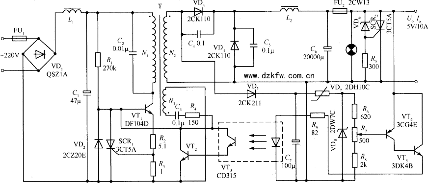 如圖是用光電耦合器隔離的正激變換式開關穩壓電源。在正激式開關電源中,不能簡單地用增加次級繞組的方法來實現隔離,而用光電隔離效果較好。VT1是開關管,VT2與光電耦合器VT3的光敏三極管組成復合變阻管,VT4、VT5組成復合誤差放大管。N2為高頻變壓器T的供直流輸出和取樣的次級繞組。N2為自激振蕩的正反饋線圈。在此電路中,雖然直流電壓輸出端與誤差放大器的取樣電路是合在一起的,但是放大器輸出的信號不是用電路連接,而是用光的形式耦合到開關管VTl的基極,從而實現了誤差放大器的取樣電路與開關管的電隔離。本電源的主要技術指標如下: 輸入電壓:176~240V,5~1000Hz; 輸出電壓:5V±0.5V; 輸出電流:10A; 電網穩定系數≤L%; 輸出紋波:有效值≤6.4mV,峰-峰值≤35mV; 輸出尖峰≤12mV(不含紋波); 工作頻率:25~27kHz。
