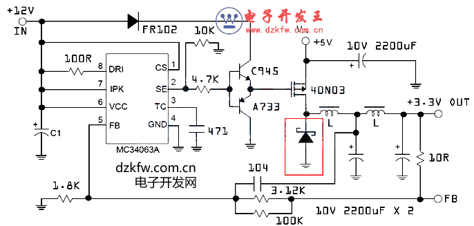 MC34063大電流降壓電路,輸入5V,輸出3.3V,采用MOSFET作為開關管,效率很高。MC34063使用12V供電,因此需要兩組電源才行。