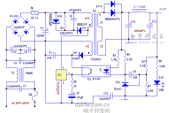 7. 12V/5A,75W電源。IC用TOP225Y,100KHz。 磁芯:PQ2625,氣息:0.3mm, 初級電感:600uH, 初級:直徑0.41單線饒48T,次級:0.47*8繞6T,反饋:4T |