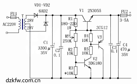元器件選擇:變壓器T選用80W~100W,輸入AC220V,輸出雙繞組AC28V。FU1選用1A,FU2選用3A~5A。VD1、VD2選用6A02。RP選用1W左右普通電位器,阻值為250K~330K,C1選用3300μF/35V電解電容,C2、C3選用0.1μF獨石電容,C4選用470μF/35V電解電容。R1選用180~220Ω/0.1W~1W,R2、R4、R5選用10KΩ、1/8W。V1選用2N3055,V2選用3DG180或2SC3953,V3選用3CG12或3CG80。