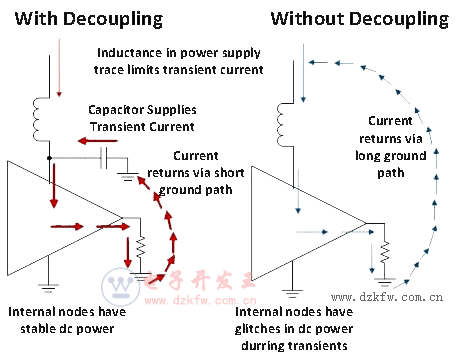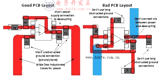 除了使用去耦電容器外,您還要在去耦電容器、電源和接地端之間采取較短的低阻抗連接。您應始終嘗試著讓去耦合連接保持較短的距離,同時避免在去耦合路徑中出現通孔,原因是通孔會增加電感。大部分產品說明書都會給出去耦合電容器的推薦值。如果沒有給出,則可以使用0.1uF.