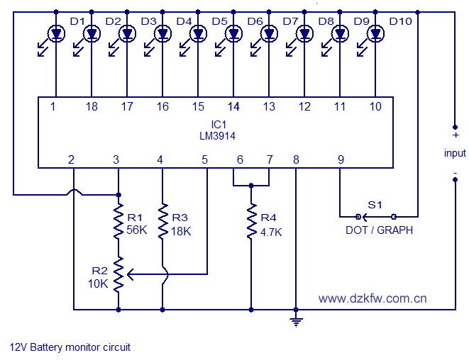 電路圖中的發光二極管D1的toD10顯示點或條形圖模式電池的水平。電阻R4引腳6,7和地面之間的連接,控制LED的亮度。電阻R1和R2的壺形成一個分壓器網絡的POT R2可以用于校準。